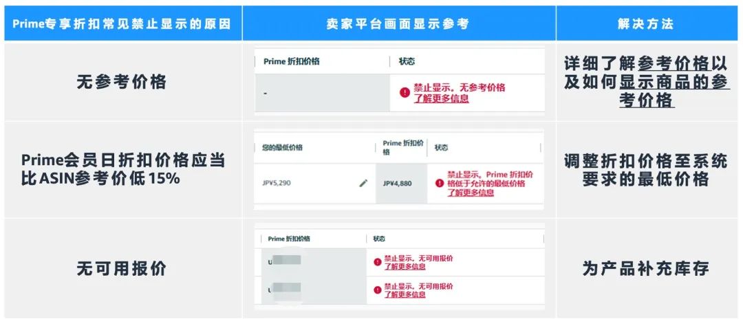 如果您已经为商品填写了参考价,但后台的Prime专享折扣提报状态显示为“禁止显示”或“无参考价格”,则说明您为商品设置的参考价格没有通过亚马逊系统验证, 建议您转为商品设置Prime定向优惠券, 抓住Prime会员日流量机遇!